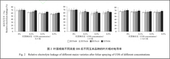 2. 三個葉齡葉面噴施殼寡糖第二天測定的葉片電導率和丙二醛含量,均較清水對照降低。試驗表明,殼寡糖葉面噴施對細胞膜具有保護作用。